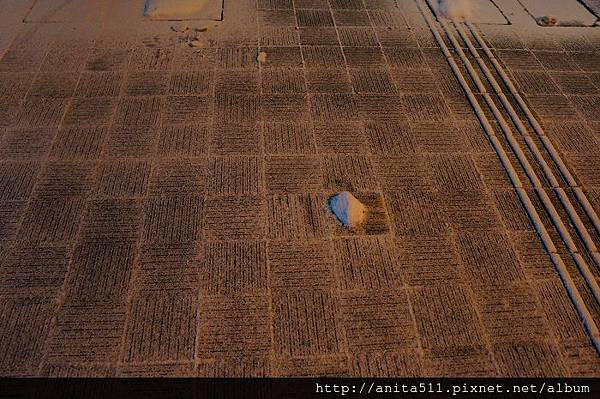 細細的粉雪。剛剛下在人行道的紅磚上,好漂亮喔!