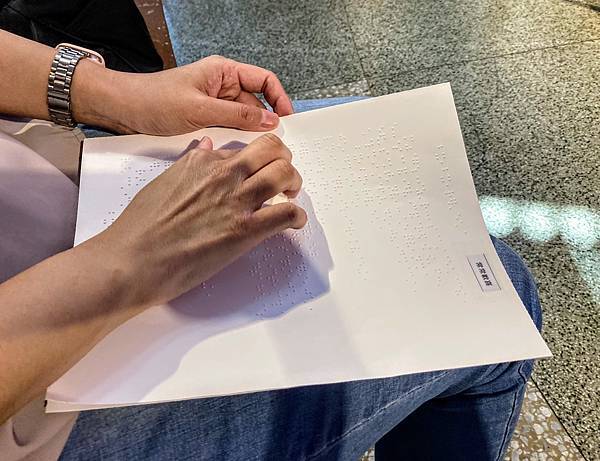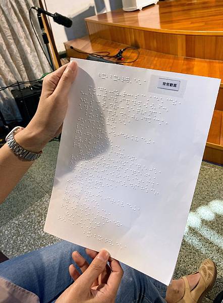 聚會開始之前團長拿出「常常歡喜」的歌譜做準備,我看到她手上的歌譜驚訝得不得了!! 我第一次看到「點字」的歌譜!! 她說,這其實是歌詞譜,旋律是合唱團的老師唱給他們聽,他們是用聽的學會這首詩歌。而他們合唱團的四部和聲,是老師一個聲部一個聲部錄音,她們就這樣把詩歌背起來的。太.......厲害了!! 太令人敬佩了!!